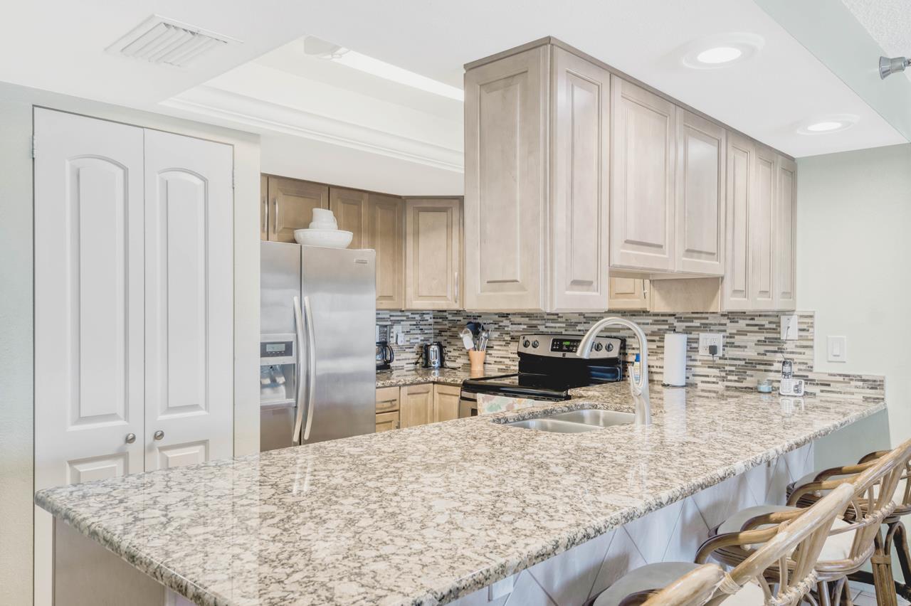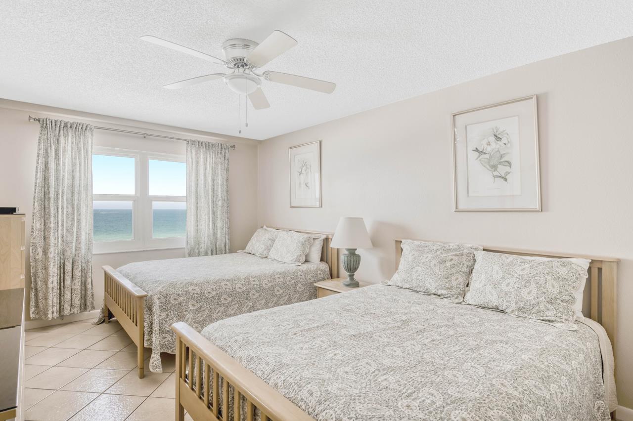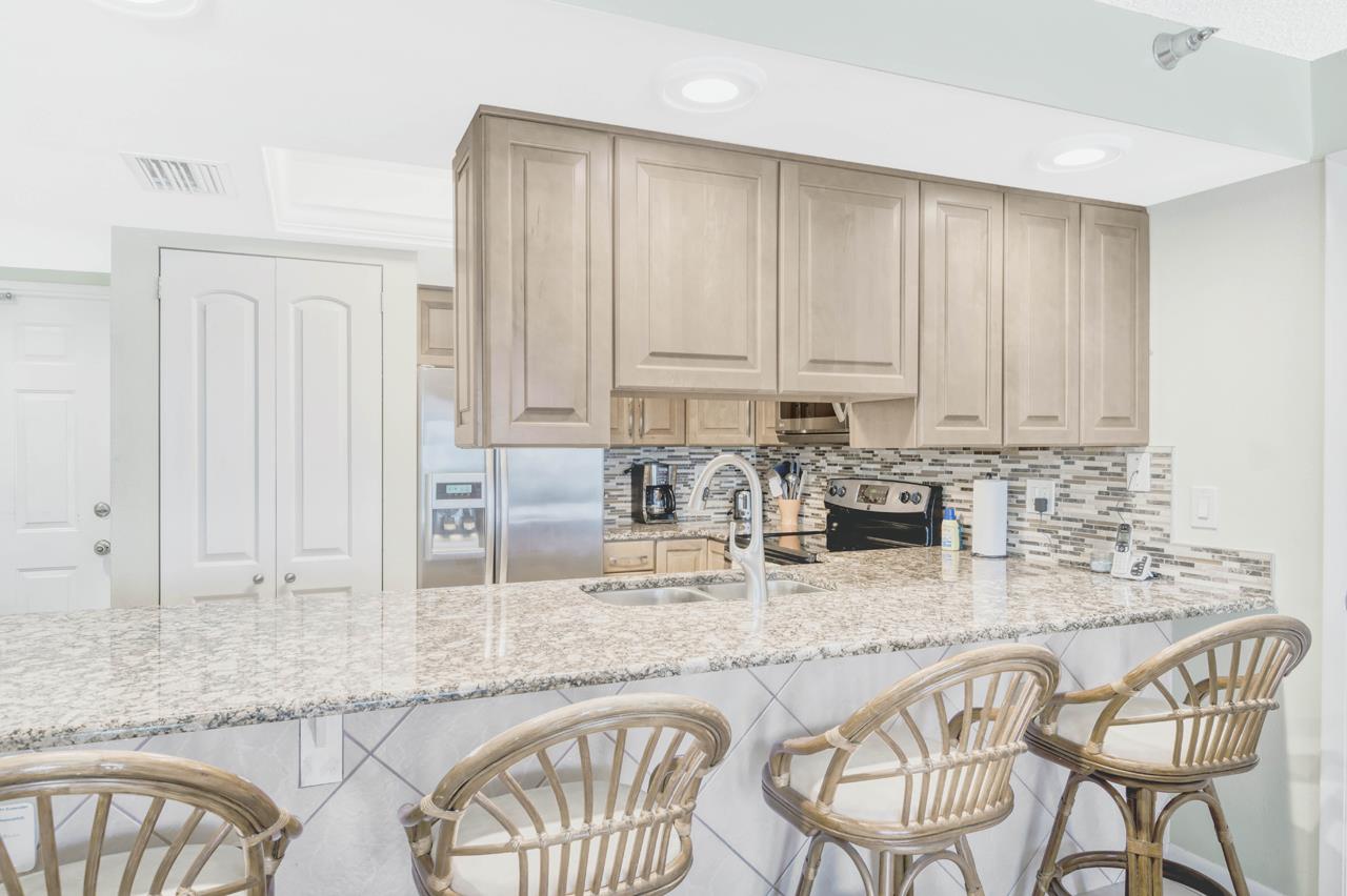 Elegant upgrades and beautiful gulf front views make this cozy condominium a standout. It features a relaxed beach style with tile flooring throughout. A large beach front balcony serves as the backdrop for a spacious living room that includes comfortable wicker furniture, a flat screen tv, and a dining table that comfortably seats 4. The fully equipped kitchen is highlighted by stainless steel appliances , marble countertops, a stunning tile backsplash, and a gorgeous tile front breakfast bar with additional seating for dining.  Also included is a washer and dryer giving you all the comforts of home. The large master bedroom comes complete with a king sized bed, ensuite bathroom, flat screen tv, and balcony access. The second bedroom has a large window with a gulf view, a flat screen tv, and two queen sized beds. There is elegant floor to ceiling tile and marble countertops in both bathrooms as well a double vanity in the master bathroom.